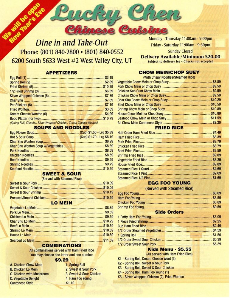 Introducing Lucky Chen, a Chinese restaurant located in Kearns, UT. Lucky Chen offers a variety of delicious dishes with options for takeout, delivery, and catering. The menu includes appetizers like Fried Shrimp, Char Shu, and Cream Cheese Wonton. For soups and noodles, try the Beef Noodles or Char Shu Wonton Soup. Their Sweet & Sour options include Pressed Almond Chicken and Sweet & Sour Pork. Lucky Chen also provides many vegetarian choices and accepts various payment methods including cryptocurrency. With a casual atmosphere and outdoor seating, Lucky Chen is perfect for groups and families. Don't miss out on the flavorful dishes and exceptional service this restaurant has to offer.